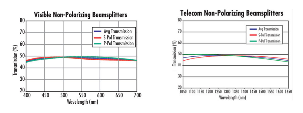 宽带非偏振分光棱镜包含一对精确高容差直角棱镜,相互胶合在一起,并且在各棱镜的斜边面上涂有金属介质。金属介电混合覆膜的低偏振依赖性使S和P偏振状态的投射和反射率分别保持在6%以内。这些分光器在其规定的波长范围内能够在光谱上保持平稳,从而减少了入射角度或汇聚/发散光束的变化所产生的影响。